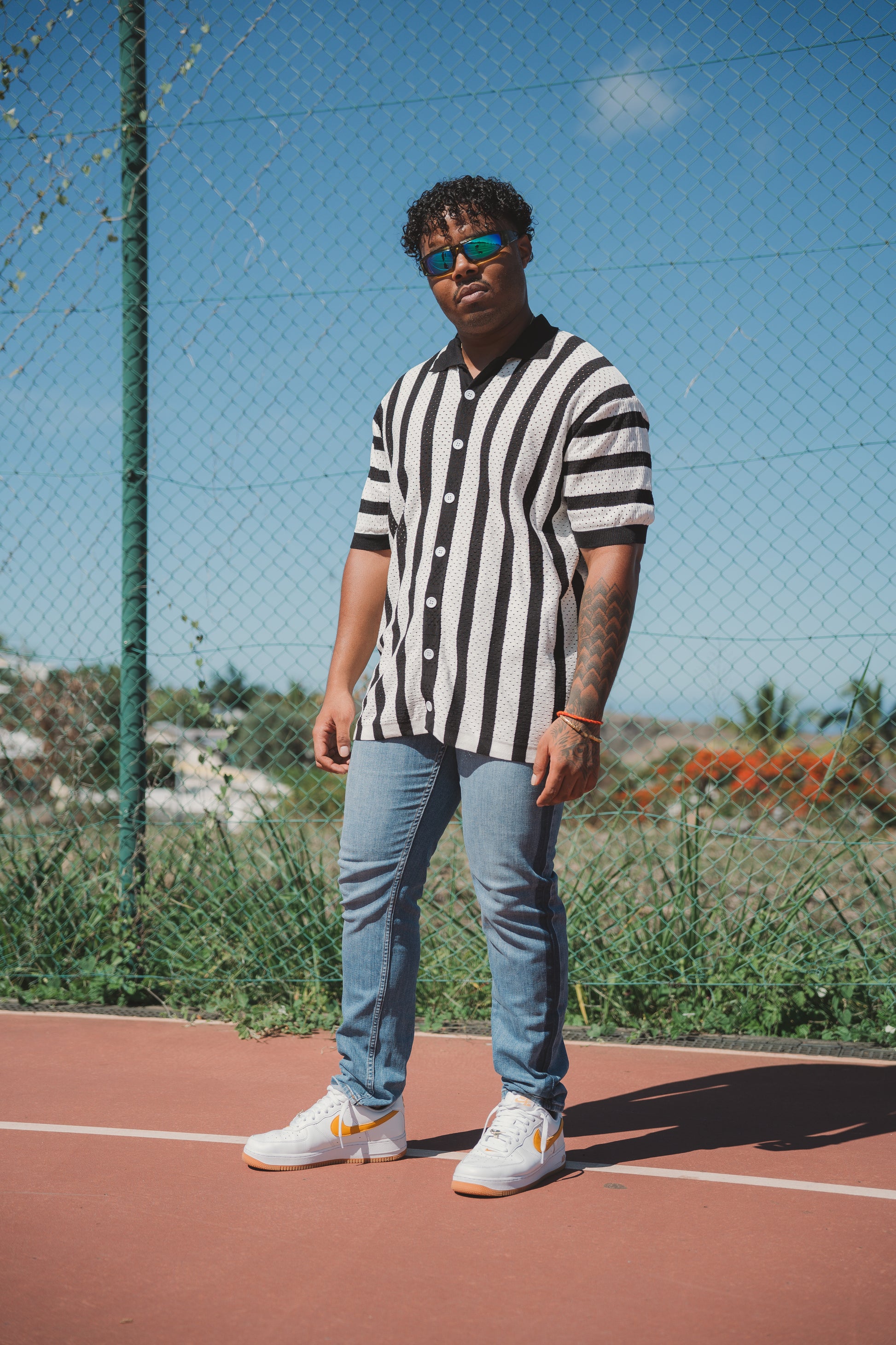 Ce produit est une chemise à rayures verticales noires et blanches, dotée d'une texture en maille perforée qui lui confère un style unique et respirant. Les rayures noires varient en largeur, créant un motif dynamique et audacieux. Polyvalente, elle s'accorde aussi bien avec un jean qu'un pantalon chic. Une pièce incontournable pour affirmer votre personnalité avec un style propre à vous.